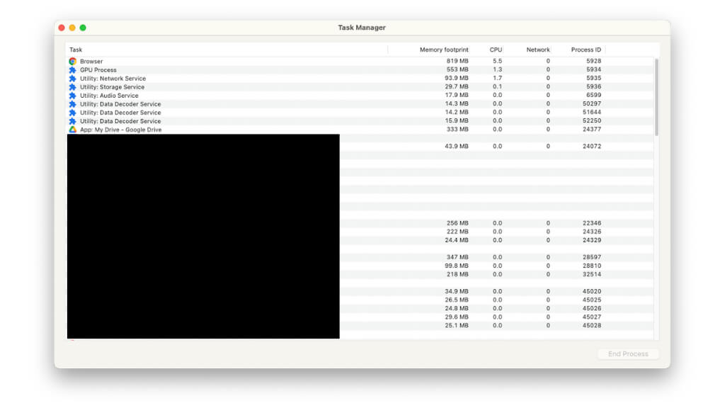 Om te weten of Chrome te veel CPU-kracht verbruikt, is de snelste manier om Taakbeheer in Windows of de Activiteitenmonitor in macOS te openen. Daar kunt u controleren welk percentage van uw CPU door Chrome wordt gebruikt. Als je niet zeker weet hoe je dat moet doen, bekijk dan onze uitgebreide handleiding over Windows Taakbeheer en onze handleiding over macOS Activity Monitor.
