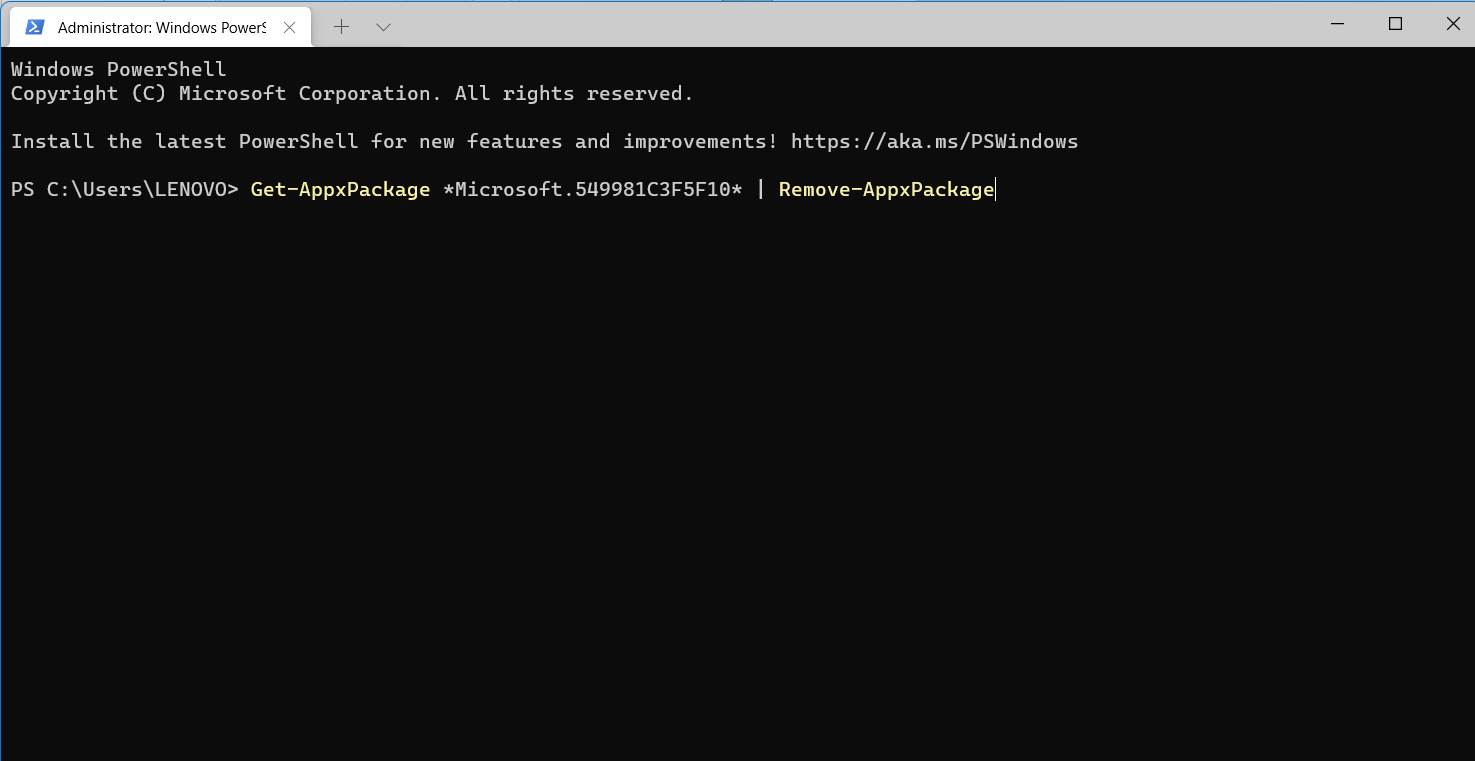 Get-AppxPackage *Microsoft.549981C3F5F10* | Remove-AppxPackage