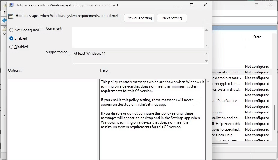 Opmerking:Om de wijzigingen van kracht te laten worden, moet u uw computer nu opnieuw opstarten. Het bericht 'Er wordt niet aan de minimale systeemvereisten voldaan' verschijnt na het opnieuw opstarten niet op het bureaublad. Open nogmaals het beleid Berichten verbergen wanneer niet aan de Windows-systeemvereisten wordt voldaan en stel dit in op Niet geconfigureerd als u de wijzigingen ongedaan wilt maken.
