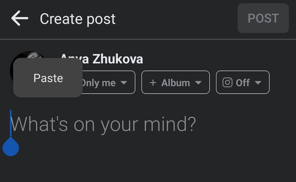 - Maak een nieuw bericht op Facebook. Houd vervolgens ingedrukt totdat de optie verschijntPlakkenverschijnt.