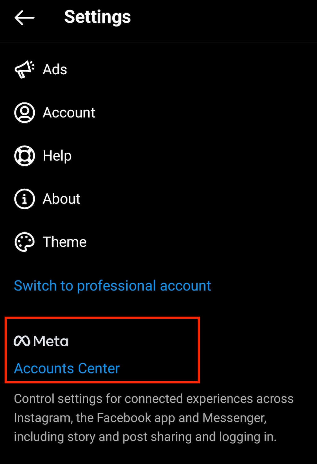 - Scroll naar beneden en selecteerAccountcentrumonderMeta.