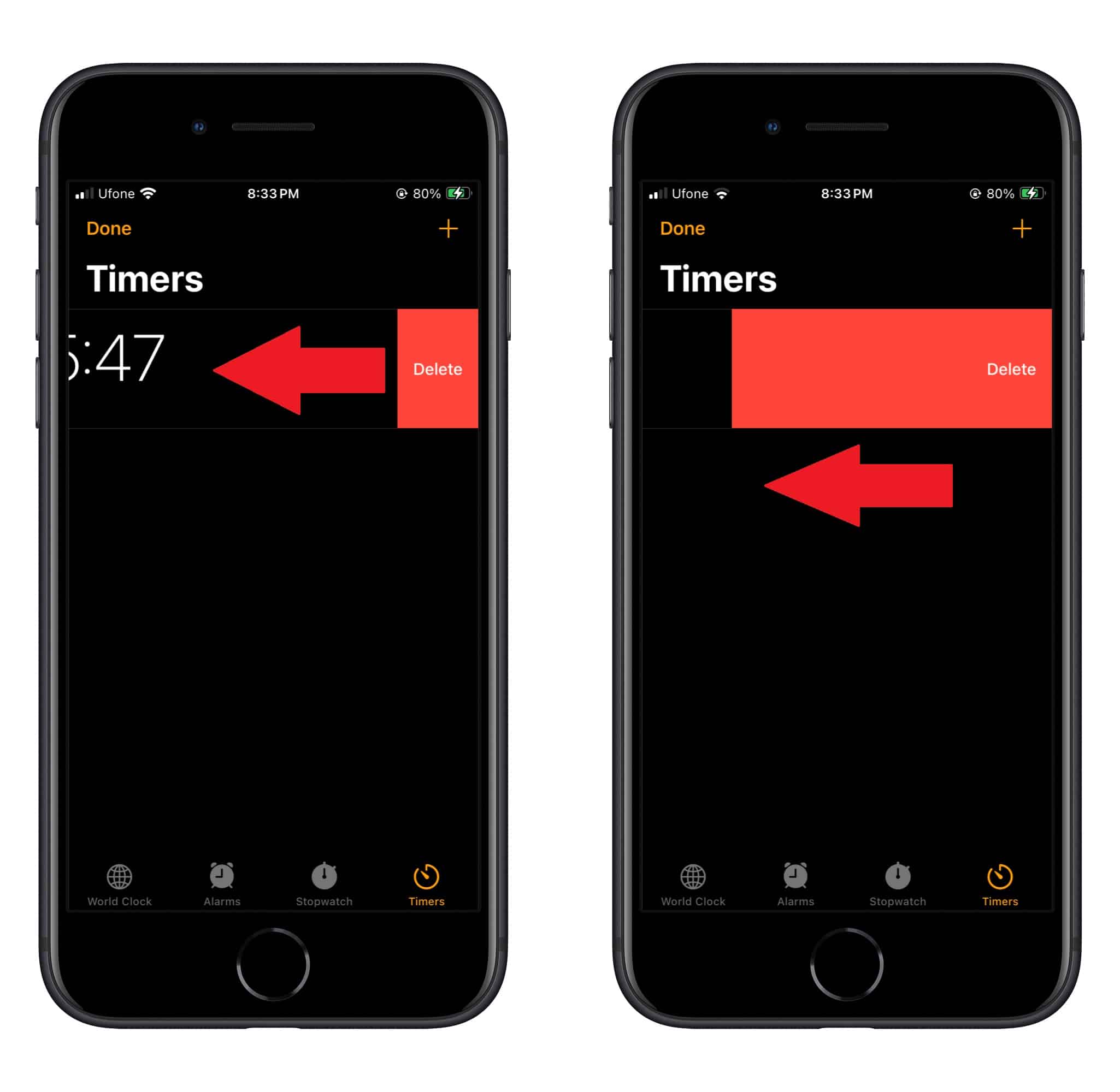 - Veeg naar links op een timer en je ziet eenVerwijderenpictogram aan de rechterkant. Je kunt ook helemaal naar links over de timer vegen om deze te verwijderen.