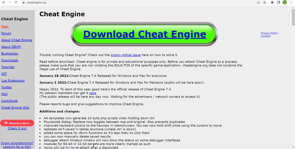 - Download om te beginnenCheat-motorvan de officiële site.