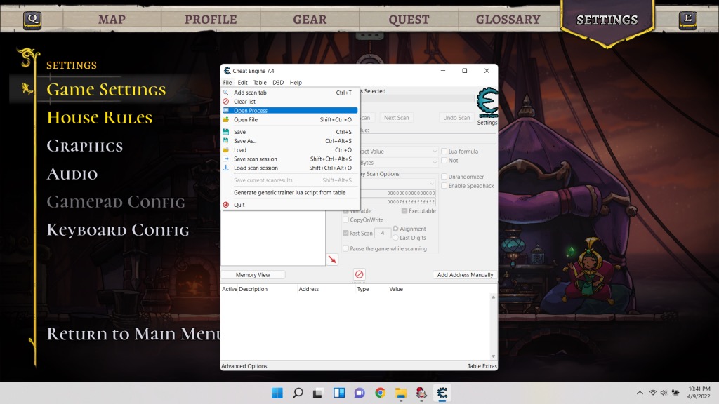 - Selecteer eerstBestand>Open procesom het spelproces met Cheat Engine te selecteren.