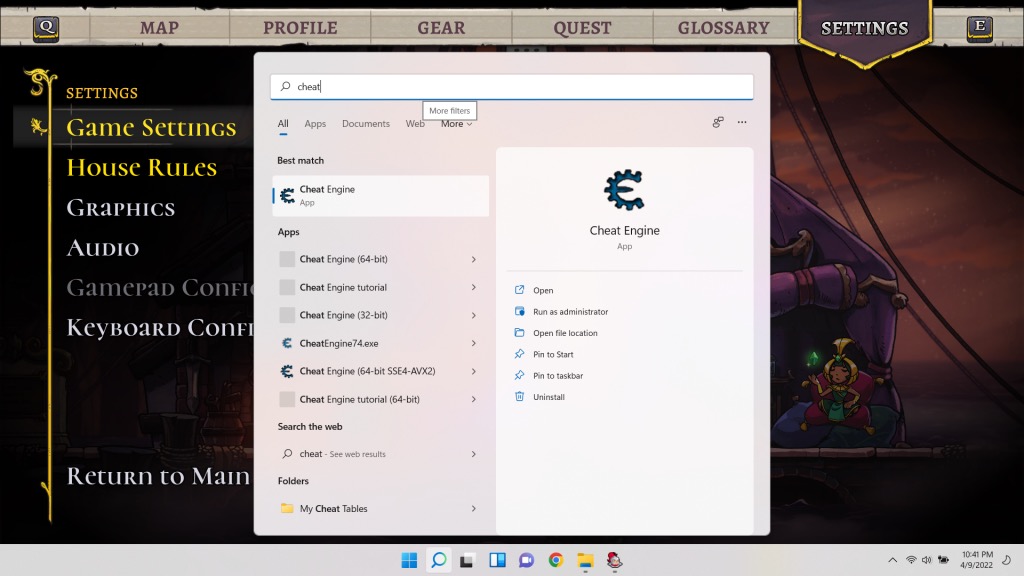 - Zoeken naarCheat-motorin het zoekvak en voer het vervolgens uit als beheerder.