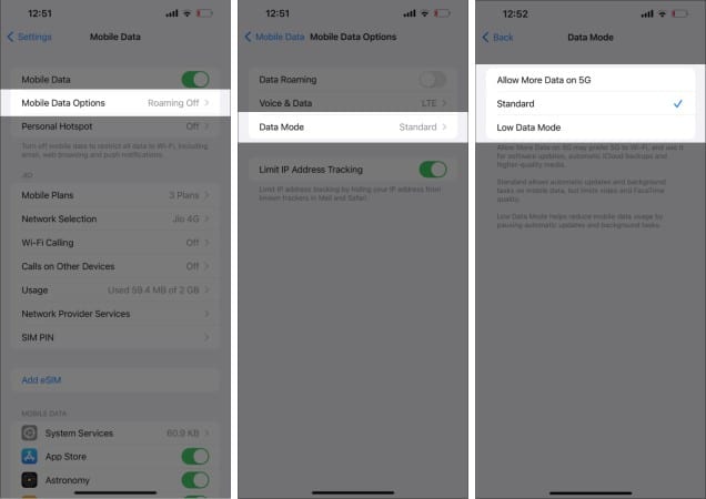 Opmerking:De optie Meer gegevens toestaan op 5G zal uw batterij aanzienlijk sneller leegmaken dan de andere twee opties. Hier is een gids om u te helpen problemen met het leeglopen van de batterij op uw iPhone op te lossen.