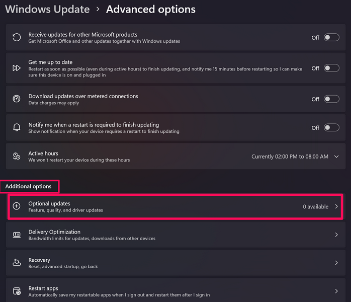 Naast het gebruik van Apparaatbeheer om stuurprogramma's bij te werken in Windows 11, kunt u ook naar het gedeelte Windows Update in de app Instellingen op uw pc of laptop gaan om uw stuurprogramma's bij te werken. U ziet dat de Windows Update-functionaliteit niet-geïnstalleerde stuurprogramma-updates bijhoudt onder het gedeelte Optionele updates, vanwaar u ze op uw Windows 11-apparaat kunt installeren.