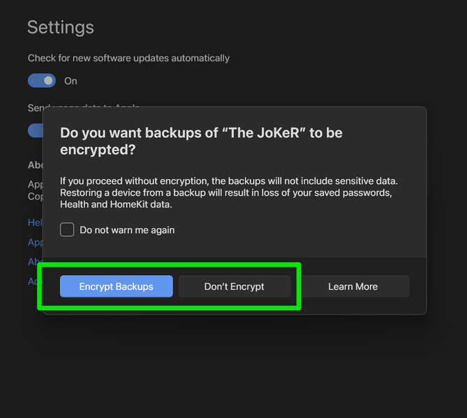 14.Nadat de update is gedownload,de Apple Devices-app maakt automatisch een back-up van uw iPhoneop uw Windows 11-apparaat. Dus, op de gegeven prompt,kies of u de back-up wilt coderen (met een wachtwoord beveiligen) of niet.