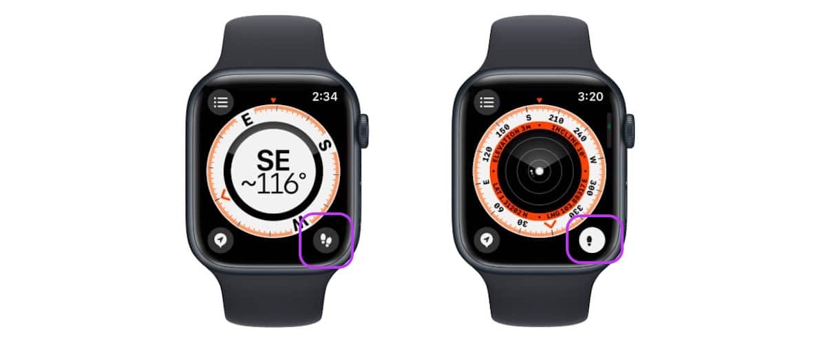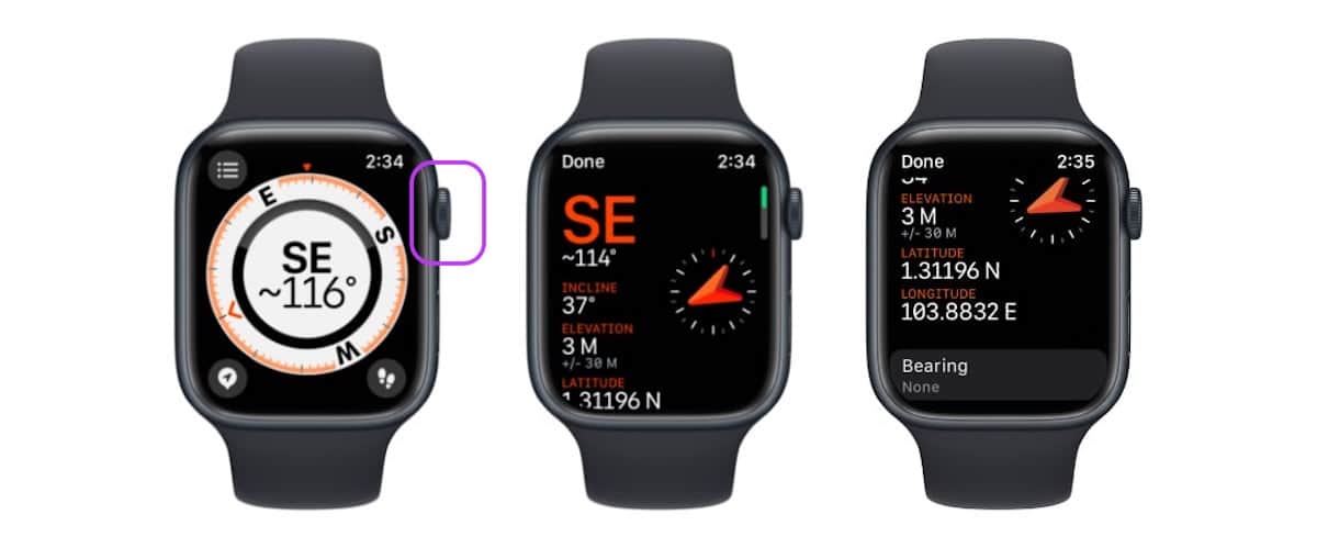 Op Apple Watch-modellen met watchOS 9 opent u eenvoudig de Kompas-app om uw richting en peiling te bekijken. Draai de Digital Crown gewoon omhoog om uw hoogte, helling en coördinaten te bekijken.