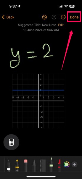 Als u nu klaar bent met het gebruik van Wiskundenotities in de Rekenmachine-app op uw iPhone op iOS 18, kunt u eenvoudigweg op de knop Gereed in de rechterbovenhoek tikken. De Rekenmachine-app slaat de notitie automatisch op.