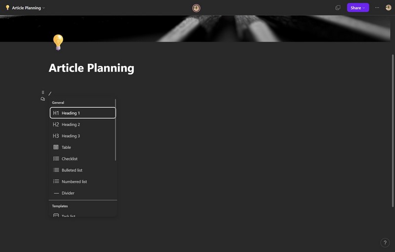 1.Zodra u uw werkruimte in Loop hebt aangemaakt en begint met het maken van documenten, kunt u de componentenlijst oproepen met a/(vooruit) slash-opdracht. Zodra u het hebt ingevoerd, opent Loop een lijst met componenten die u aan uw huidige document kunt toevoegen. De lijst varieert van emoji's, kopjes en tabellen tot takenlijsten, voortgangstrackers en stemtabellen.