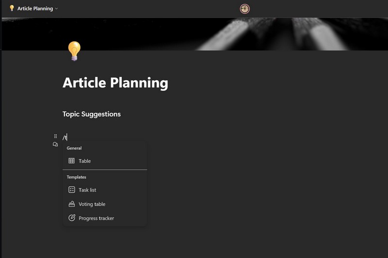 4.Als u vervolgens een tabel wilt toevoegen, gebruikt u dezelfde/commando en typ in"T"om alle tafelopties te krijgen die u kunt toevoegen.Selecteer de optieje hebt nodig ende gegevens invoerennaarmaak een georganiseerde tafelin uw document, dat kan worden bewerkt door alle leden die toegang hebben tot de pagina of de werkruimte.