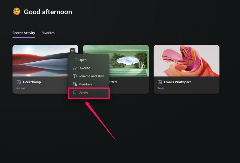 3.Bovendien, als je dat wiltleden toevoegen of verwijderenVanuit een werkruimte, de naam ervan wijzigen en de stijl ervan wijzigen, of deze toevoegen aan uw Favorietensectie, kunt u vanaf de startpagina toegang krijgen tot het contextmenu van uw werkruimte. Bekijk deVerwijder een werkruimtesectiehieronder om te weten hoe u toegang krijgt tot het contextmenu van de werkruimte in Loop.