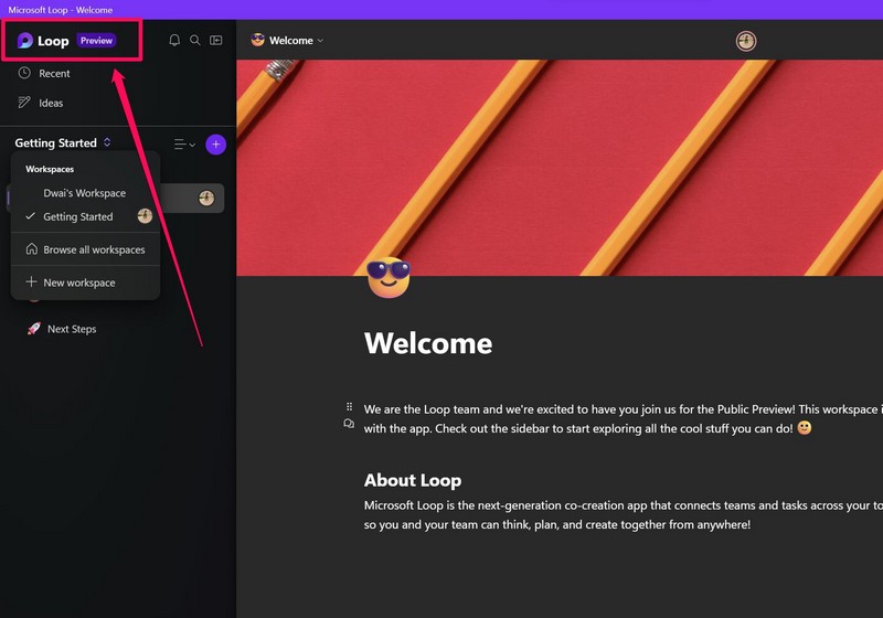 U kunt ook uw eigen werkruimte of meerdere werkruimten creëren in Microsoft Loop. Volg hiervoor de onderstaande stappen: