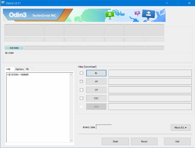 Wanneer Odin uw apparaat herkent, verschijnt er een nieuwe regel in het logboekvak, met een ID-nummer naast ‘Toegevoegd !!’, dit betekent dat Odin is verbonden met ons Samsung-apparaat en klaar is om de gewenste software te flashen.