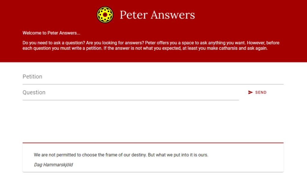 Wanneer je voor het eerstbezoek Peter Antwoorden, zie je een eenvoudige website met twee velden. Het eerste veld is AVerzoekschriftdoos en de andere is eenVraagdoos.