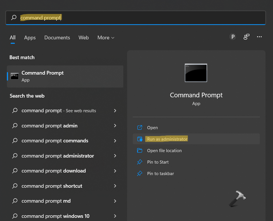 1.Open de opdrachtprompt met beheerdersrechten. Zoek hiervoor naaropdrachtpromptinWindows Zoekenen klik vervolgens opUitvoeren als beheerder. Als er door de UAC een prompt op het scherm verschijnt, klik dan opJaverder te gaan.