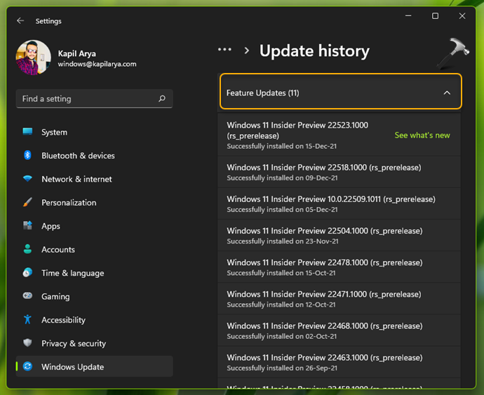 3.Onder Updategeschiedenis worden geïnstalleerde updates geclassificeerd op basis van het type waartoe ze behoren. De onderstaande schermafbeelding laat zien hoe functie-updates worden weergegeven.