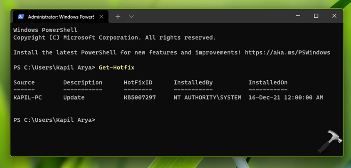 3.TypeGet-Hotfixen druk op de Enter-toets. Met deze cmdlet worden alle hotfixes weergegeven die op uw systeem zijn geïnstalleerd.