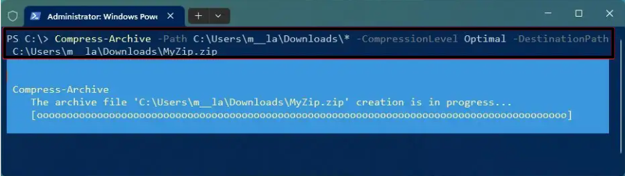 Compress-Archive -Path C:SOURCEPATHTOYOURFILES* -CompressionLevel Optimal -DestinationPath C:DESTINATIONPATHZIPPEDFILE.zip