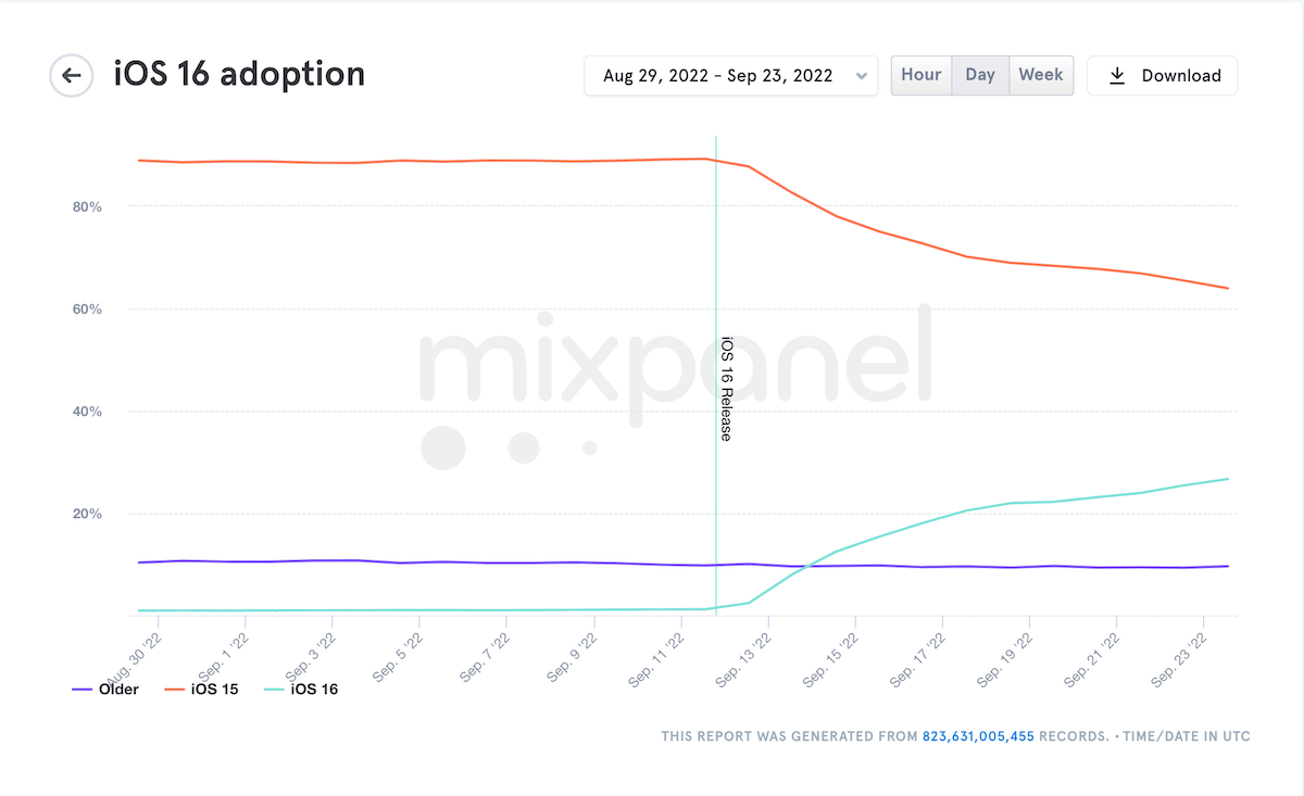 Uit een nieuw rapport van Mixpanel blijkt dat het acceptatiepercentage van de nieuwste iOS-update nog steeds veelbelovend is. Binnen tien dagen na de lancering is iOS 16 op 22 september door 25,37% van de gebruikers gedownload en op 23 september is dit percentage gestegen naar 26,59%.