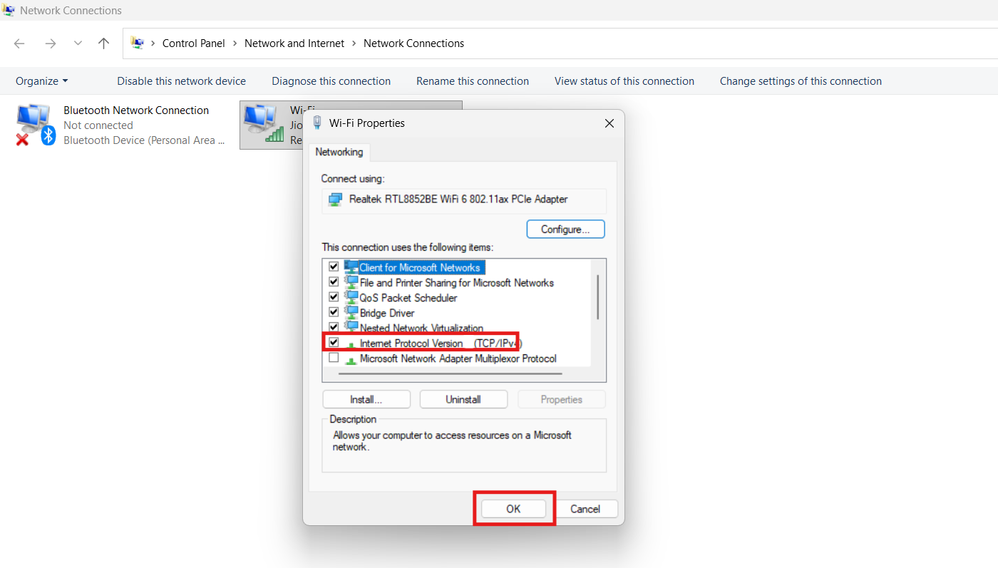 4. Wacht 10 seconden, open Eigenschappen opnieuw, controleer Internet Protocol Versie 6 (TCP/IPv6) opnieuw en selecteer OK.