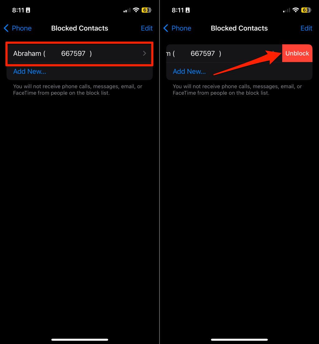 - Als de persoon op de lijst met geblokkeerde nummers staat, veegt u naar links over de naam/het nummer en tikt u opDeblokkeren.