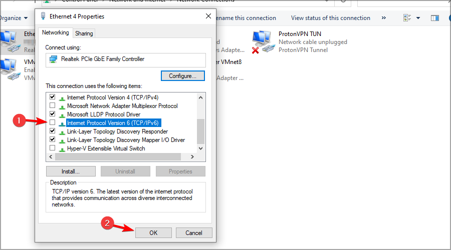 - LokaliserenInternetprotocol versie 6 (TCP/IPv6)en schakel het uit. Klik nu op OK.
