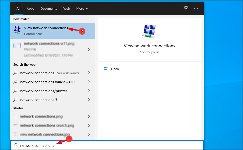 - Druk op Windows-toets + S en voer netwerkverbindingen in. SelecteerNetwerkverbindingen bekijkenuit de lijst.