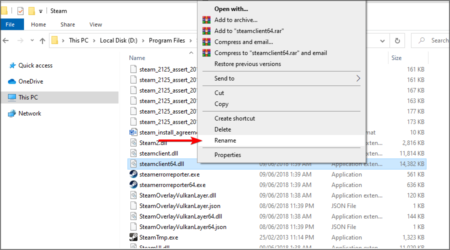 C:Program FilesSteam - Lokaliserensteamclient64.dll, klik met de rechtermuisknop en kies Naam wijzigen.