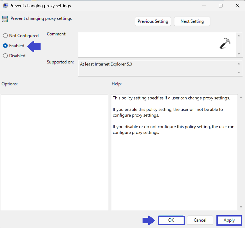 5. Selecteer Ingeschakeld om de wijziging van proxy-instellingen uit te schakelen.