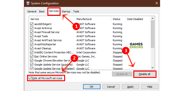 - Zorg ervoor dat alle andere services zijn aangevinkt en klik vervolgens op de knop Alles uitschakelen.