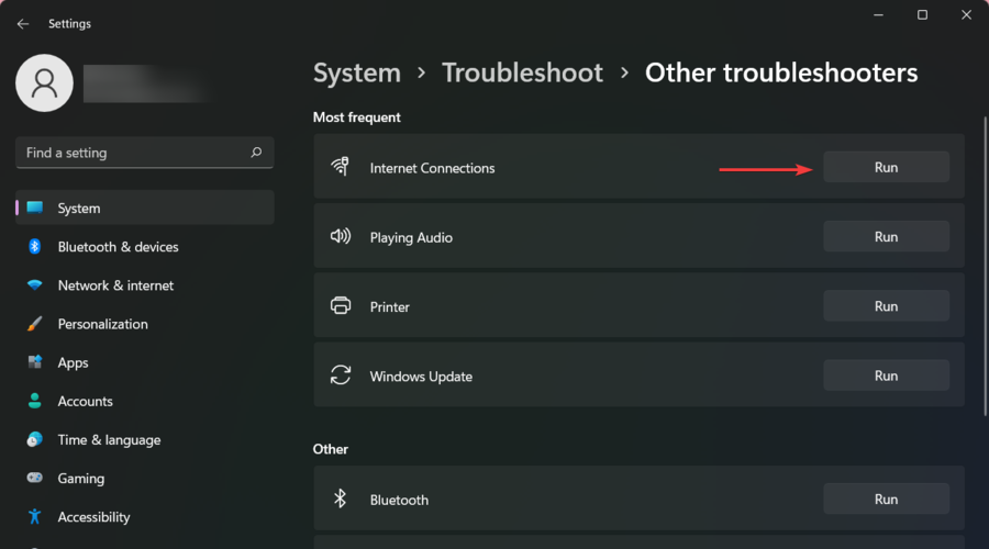 - Identificeer deInternetverbindingsectie en klik vervolgens op de knop Uitvoeren.