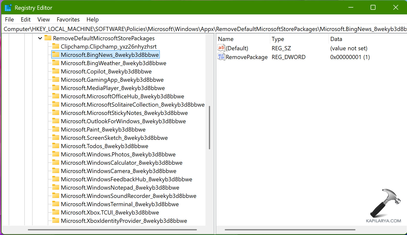 5.Nu kunt u een registersubsleutel maken naast de registersleutel RemoveDefaultMicrosoftStorePackages. Geef het een naam volgens onderstaande tabel.