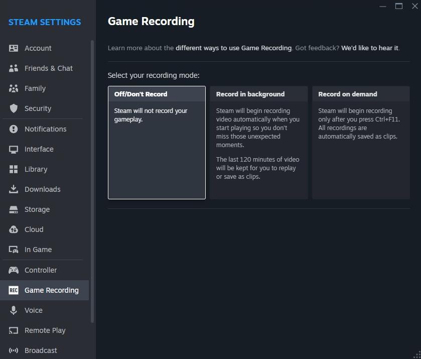 5. Klik erop om de opnamemethode te selecteren. Standaard is Steam Game Recording uitgeschakeld. U kunt de optie Opnemen op de achtergrond kiezen, die de video's automatisch opneemt wanneer u begint met spelen. De opname duurt 120 minuten. Of u kunt de optie Record on Demand selecteren, die start wanneer u op Ctrl + F11 drukt. De opgenomen video's worden opgeslagen als clips.