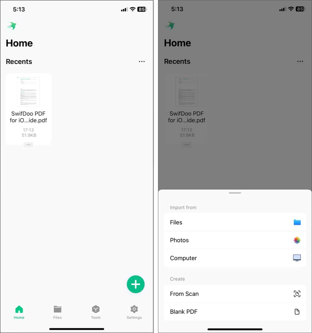 Door het plusteken in de linkeronderhoek te tikken, kunt u een lege PDF maken of er een importeren uit bestanden, foto's of computer. U kunt uw document ook rechtstreeks scannen om een PDF te maken. Trouwens, u hebt toegang tot alle tools die door Swifdoo worden aangeboden in het gedeelte Tools.