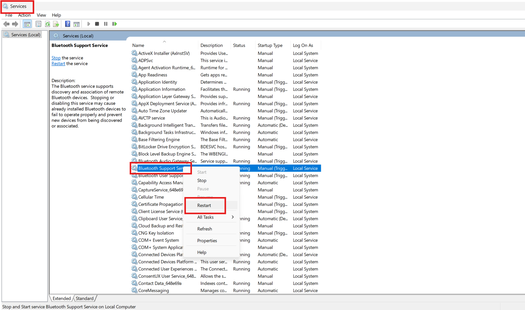2. Zoek Bluetooth Support Service, klik met de rechtermuisknop en kies Opnieuw opstarten.