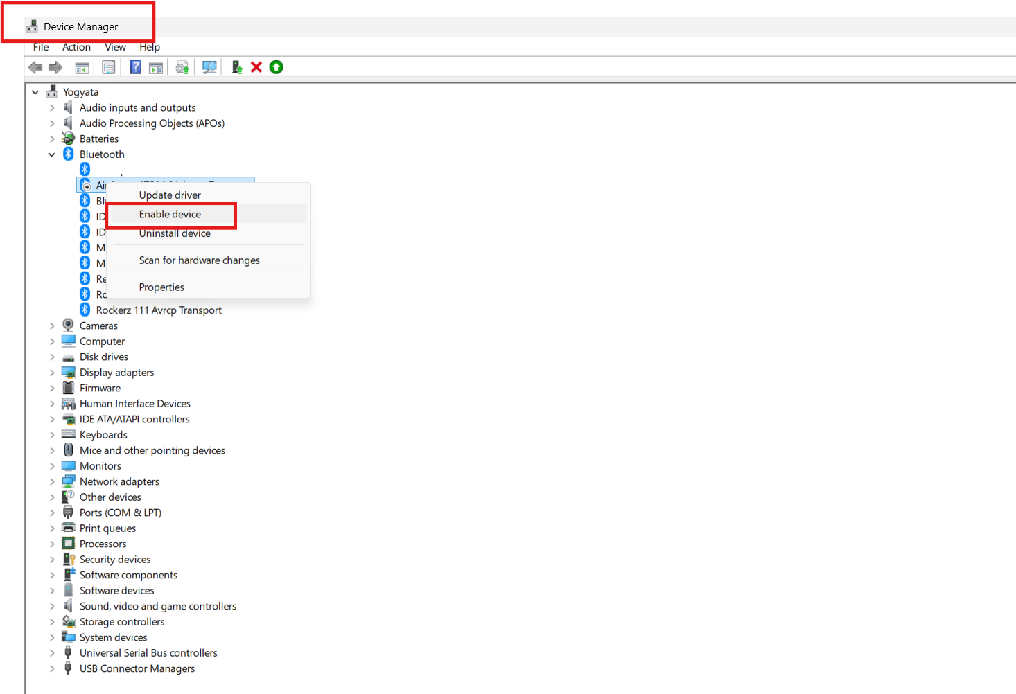 3. Klik met de rechtermuisknop op de Bluetooth-adapter en kies Apparaat inschakelen (of Stuurprogramma bijwerken op sommige apparaten).