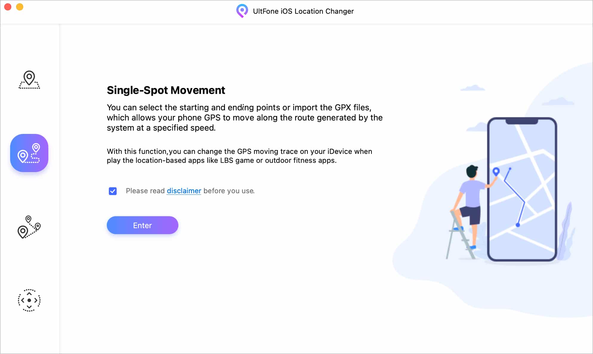 Nu we de basisfuncties van de app achter de rug hebben, gaan we kijken hoe u uw locatie kunt wijzigen met UltFone. De interface is vrij eenvoudig en duidelijk. Het enige dat u hoeft te doen, is onderstaande stappen volgen om vlot door de app te navigeren.