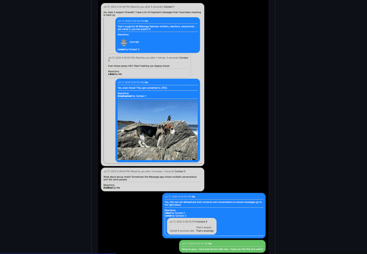 Ik heb veel tijd besteed aan het reverse-engineeren van bijna elk aspect van de iMessage SQLite-tabellen van Apple om dit programma te bouwen. Voor zover ik weet zijn er geen andere tools die het volledige corpus van iMessage-functies ondersteunen, inclusief bewerkte berichten, app-berichten, reacties en discussielijnen.