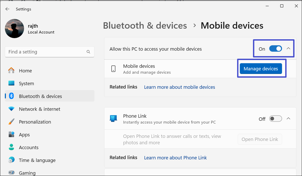 3. Schakel vervolgens de “Geef deze pc toegang tot uw mobiele apparaten' schakel en klik op de 'Beheer apparaten'knop hieronder.
