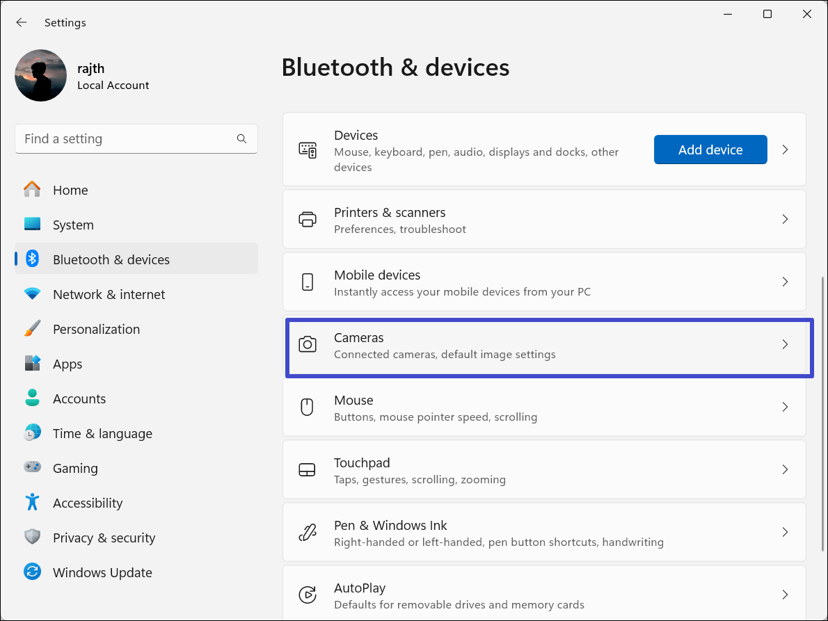 1. Nadat u het mobiele apparaat hebt ingeschakeld, gaat u terug naar “Bluetooth & apparaten”instellingen in de Instellingen en selecteer “Camera's“.