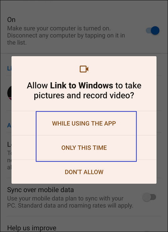 4. Laat vervolgens deKoppeling met Windowsapp om toegang te krijgen tot uw camera op uw mobiele apparaat.