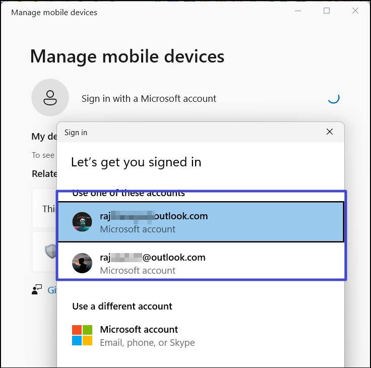 3. Als u bent aangemeld bij een Microsoft-account, selecteert u een account om u aan te melden.