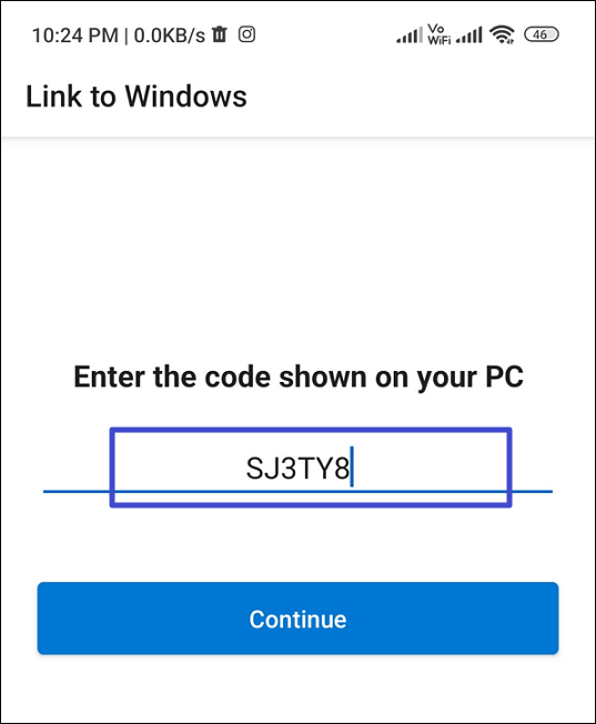 7. Voer daarna de verificatiecode in die wordt weergegeven in het venster ‘Mobiel apparaat beheren’ van uw pc in hetKoppeling met Windowsapp op uw mobiele telefoon.