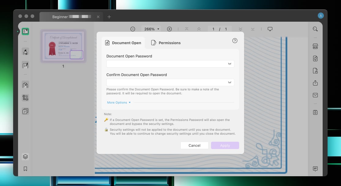 Voor een betere privacy kunt u, terwijl u een PDF met anderen deelt, de PDF beveiligen met een wachtwoord. U hebt de mogelijkheid om een toestemmingswachtwoord of een open wachtwoord in te stellen, afhankelijk van uw voorkeuren.