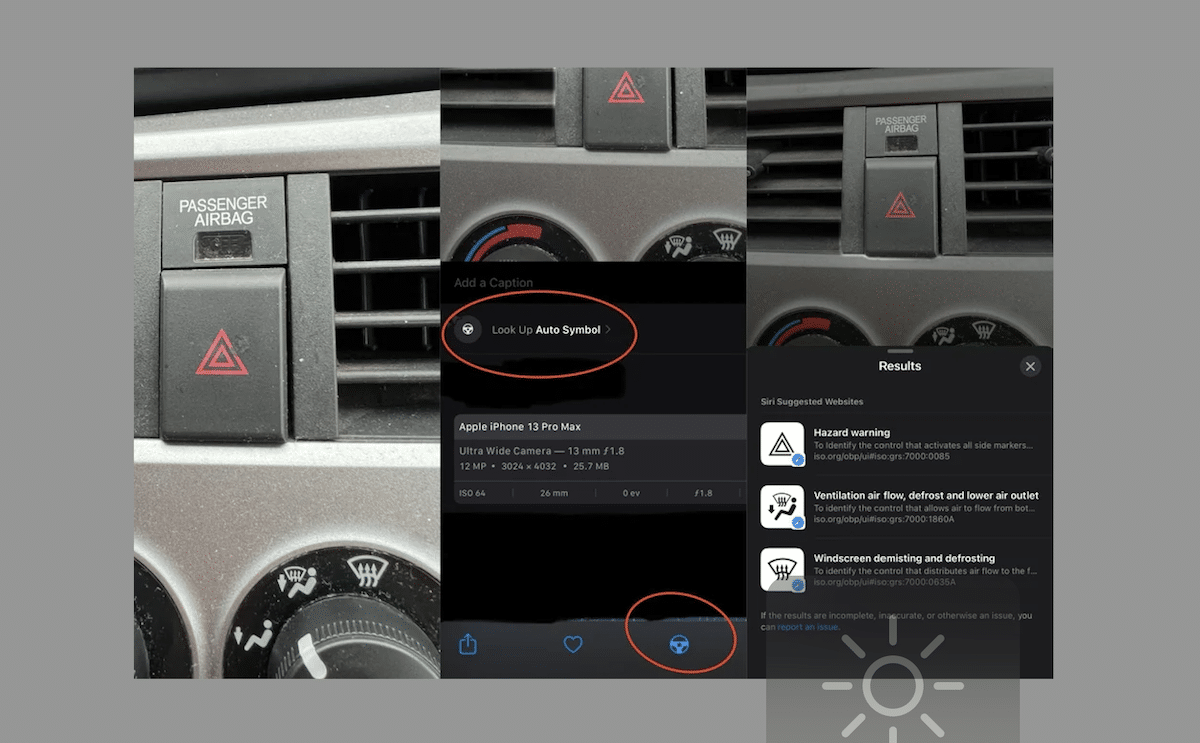 Reddit-gebruiker@Yahloverontdekte dat de Visual Look Up in de komende update autosymbolen zoals gevaar, ventilatie en ontwaseming en ontdooiing van de voorruit kan identificeren.