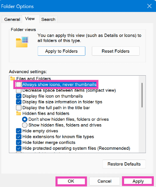 Stap 4:Schakel over naar deWeergavetabblad en schakel het selectievakje naast uitToon altijd pictogrammen, nooit miniaturen.
