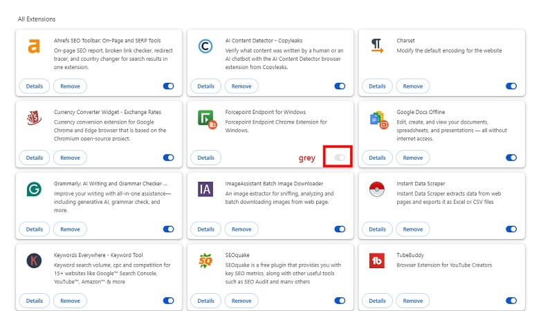 Stap 3Naast elke extensie op de extensiepagina vindt u een schakelknop. Klik op de schakelknop om de extensie uit te schakelen; het wordt grijs als het is uitgeschakeld.