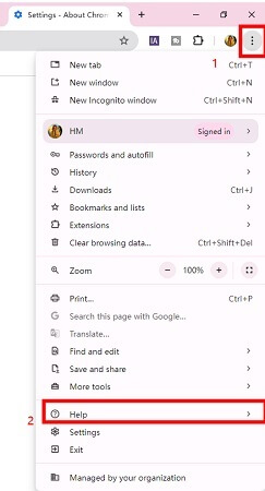 Stap 1Start Google Chrome en klik op de drie stippen in de rechterbovenhoek, selecteer 'Help,